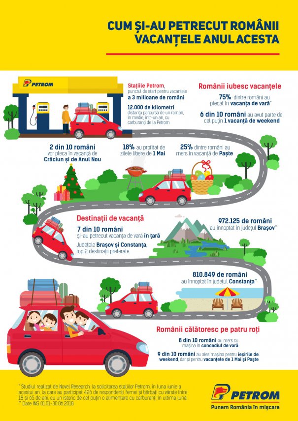 Românilor le plac vacanţele, iar cea de vară rămâne cel mai important concediu al anului: 75% dintre participanţii la un studiu realizat de Petrom au profitat de vacanţa de vară, anul acesta. 75.9% dintre românii care au alimentat în staţiile Petrom au mers în vacanţă, în sezonul cald, fie singuri, fie cu familia sau cu prietenii, arată un studiu naţional realizat la solicitarea staţiilor Petrom, în luna iunie a acestui an. La cercetare au participat 426 de respondenţi, femei şi bărbaţi cu vârste între 18 şi 65 de ani, cu un istoric de cel puţin o alimentare cu carburanţi în ultima lună.