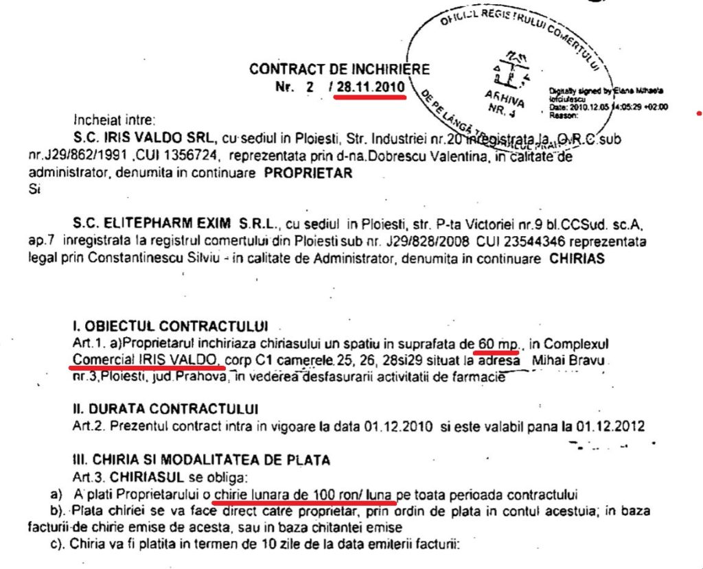 Contractul prin care Constantinescu a închiriat 60 de mp cu 100 pe lună, în „Complexul Comercial <Iris Val-do> din Ploiești”.