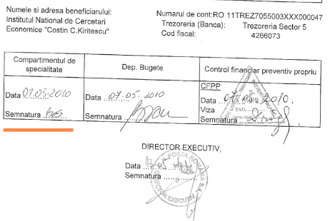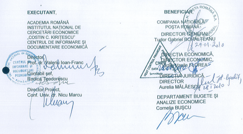 Ca în cazul oricărui contract trucat, el este semnat în mod nenatural mai întâi de executant (Academia Română – Centrul de Informare și Documentare Economică), în 27 ianuarie 2010, în aceeași zi în care a depus oferta și care nu avea cum să fie evaluată. Abia apoi este semnat de cel care l-a inițiat (Poșta Română care a comandat contractul și care se presupune că l-a originat și trebuia să îl trimită ea spre semnare, semnează abia în 29 ianuarie 2010). În cazul unui contract netrucat, ar fi trebuit să fie vice-versa: contractul e redactat și semnat de beneficiar (care comandă) care trece în contract termenii (acceptați ai ofertei) și abia apoi semnat de executant. Semnăturile celor 3 aflați în conflict de interese fiind membri în Asociația lui Marcu cu sediul pus la dispoziție de Valeriu Ioan-Franc, pe același document, sunt dovada conflictului de interese.
