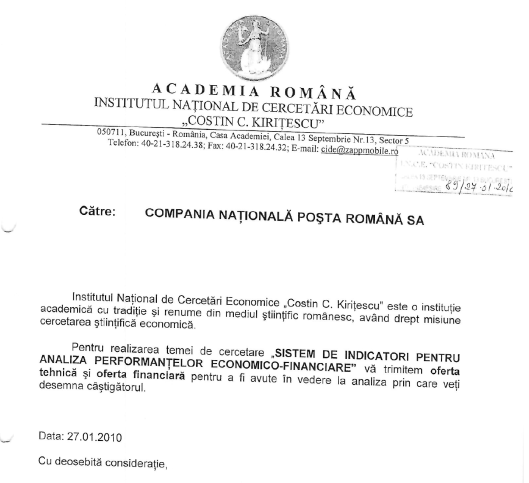 Concret, așa cum am arătat, în 27.01.2010, Academia Română – INCE – Centrul de Documentare, trimite oferta de ,,10.500 de Euro, fără TVA”, acceptată de către Poșta Română.