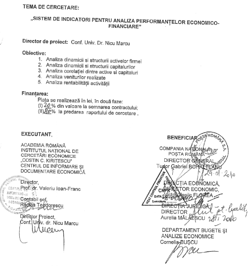 Așa cum se observă din obiectul contractului, tema de cercetare a fost analiza dinamicii și structurii activelor Poștei Române, analiza dinamicii și structurii capitalurilor, analiza corelației dintre structuri și capitaluri, analiza veniturilor realizate și analiza rentabilității activității, adică o simplă folosire, în dinamică, a indicatorilor pe care deja Poșta Română îi avea, și mai mult, trebuiau deja analizați de propriul deparament de ,,bugete și analize economice”.