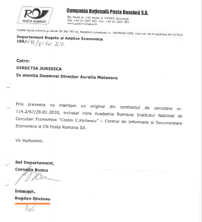 Așadar, în 20 ianuarie 2010, șefa departamentului ,,analize economice” din Poșta Română se trezește brusc dimineața și își definește nevoia (imediat aprobată de Tudor Bohâlțeanu) de ,,cercetare documentată științific” privind ,,Sistemul de indicatori pentru analiza performanțelor economico-financiare ale Companiei Naționale Poșta Română”. Mai sus, vedeți nota de fundamentare și inexplicabila evaluare a unui contract de consultanță de ,,aproximativ 10.500 de Euro fără TVA” pentru asta.