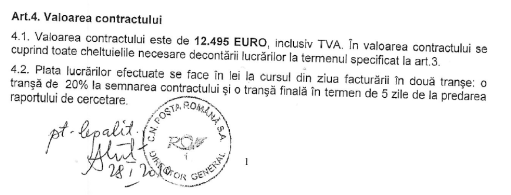 În contract, semnatarii Nicu Marcu, Valeriu Ioan Franc și Gabriel Tudor Bohâlțeanu, falsifică rezultatul achiziției publice (10.500 de Euro) și, prin fals în raport cu oferta acceptată în cadrul achiziției trucate, în aceeași zi cu oferta (27.01.2010), semnatarii umflă prețul la 12.495 de Euro, aduăgând nelegal și prejudiciind Poșta Română încă 19% la valoarea de ofertă: