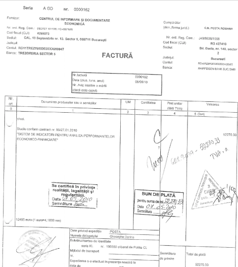 Falsificarea prețului contractului în raport cu oferta (parte a contractului) și cu statutul de neplătitor de TVA al Centrului de Informare și Documentare Economică – INCE din Academia Română, este evidentă și în raport de factura emisă de Centru și achitată fără obiecții de către Bohâlțeanu, certificată pentru ,,legalitate” de Bogdan Sticlosu.