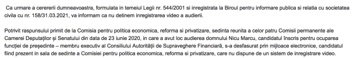 La fel cum nici Parlamentul României nu mai găsește înregistrarea VIDEO a Comisiilor Reunite de Buget Finanțe, Economică, etc, în care a fost audiat Nicu Marcu în iunie 2020, ca să devină Președinte ASF (în urma trocului politic PSD-PNL-USR-Pro România, prin care Nicu Marcu lăsa liberă poziția de vicepreședinte a Curții de Conturi prin numirea la ASF, astfel încât vicepreședinte al Curții de Conturi să devină Ilie Sârbu, socrul lui Victor Ponta).