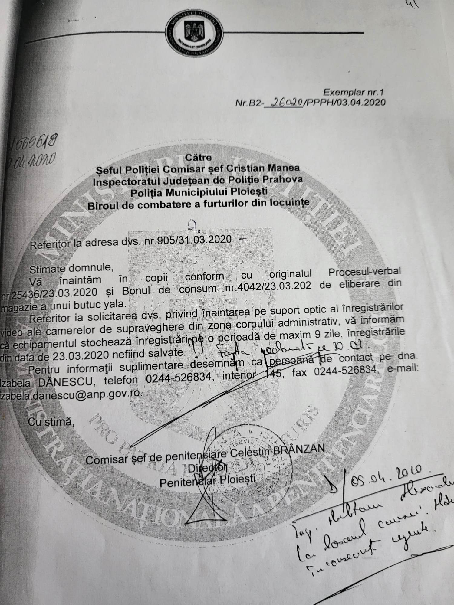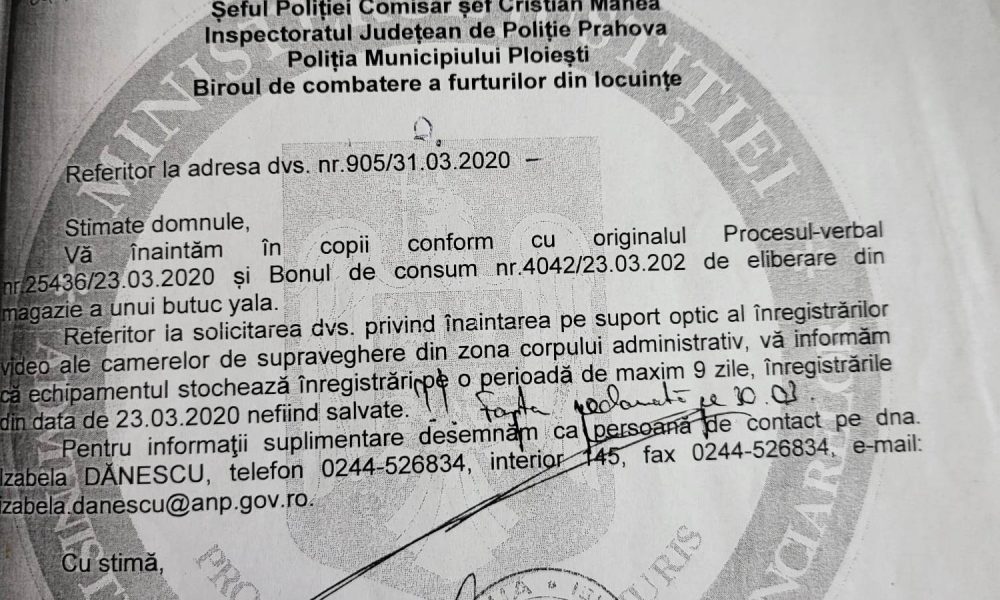 La data de 03.04.2020, prin adresa nr 26020/PPPH/03.04.2020, Directorul de la aceea data, Celestin Branzan in formeaza oficial IPJ Prahova ca, „suportul optic al inregistrarilor ale camerelor de supraveghere din zona corpului administrativ se stocheaza pe o perioada de maxim 9 zile (o mare „gogoroata”, contrara tuturor prevederilor legale si ordinelor interne), iar inregsitrarile din data de 23.03.2020 NU au fost SALVATE.