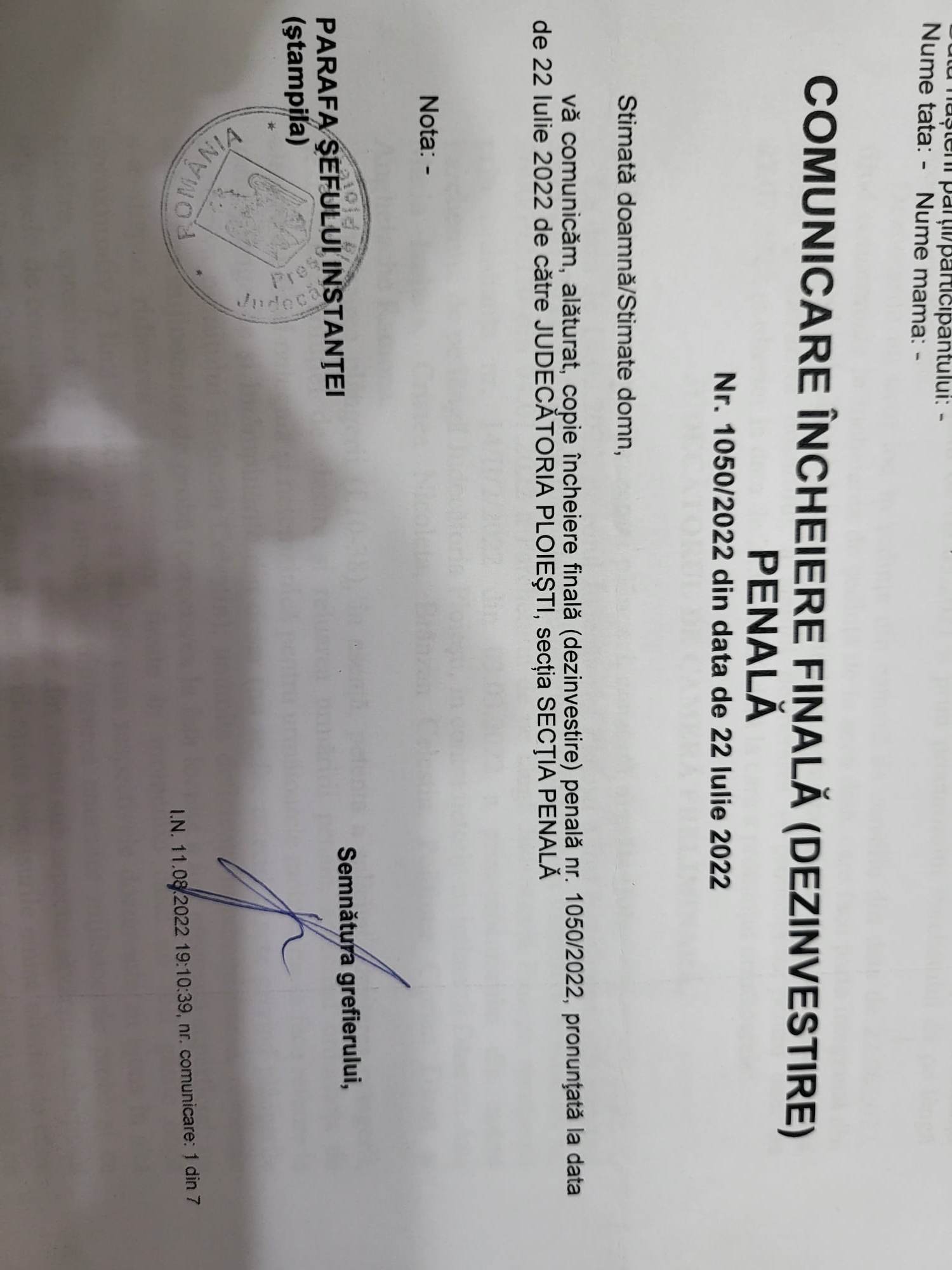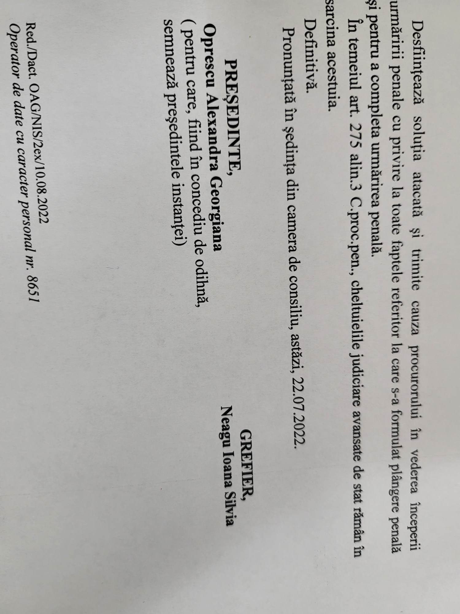 Si, pentru eventualii „carcotasi”, sa nu avem probleme in instanta, va precizam ca cele dezvaluite de noi au fost constatate si de catre un judecator care prin incheierea finala (dezinvestire) penala nr 1050/2022, pronuntata la data de 22 iulie 2022 de catre Judecatoria Ploiesti, Sectia Penala, in temeiul art 341 alin 6 lit B) C. proc. pen., a admis plangerea formulata de petent impotriva Ordonantei nr 2600/P/2022 a Parchetului de pe langa Judecatoria Ploiesti, mentinuta prin Ordonanta 14/II/2022 din 03.03.2022 a prim -procurorului in contradictpriu cu intimatii Danescu Ana Maria Izabela, Cristea Nicoleta, Brazan Celestin, Polifrone Ciprian Danut si Anghelache Ramona!