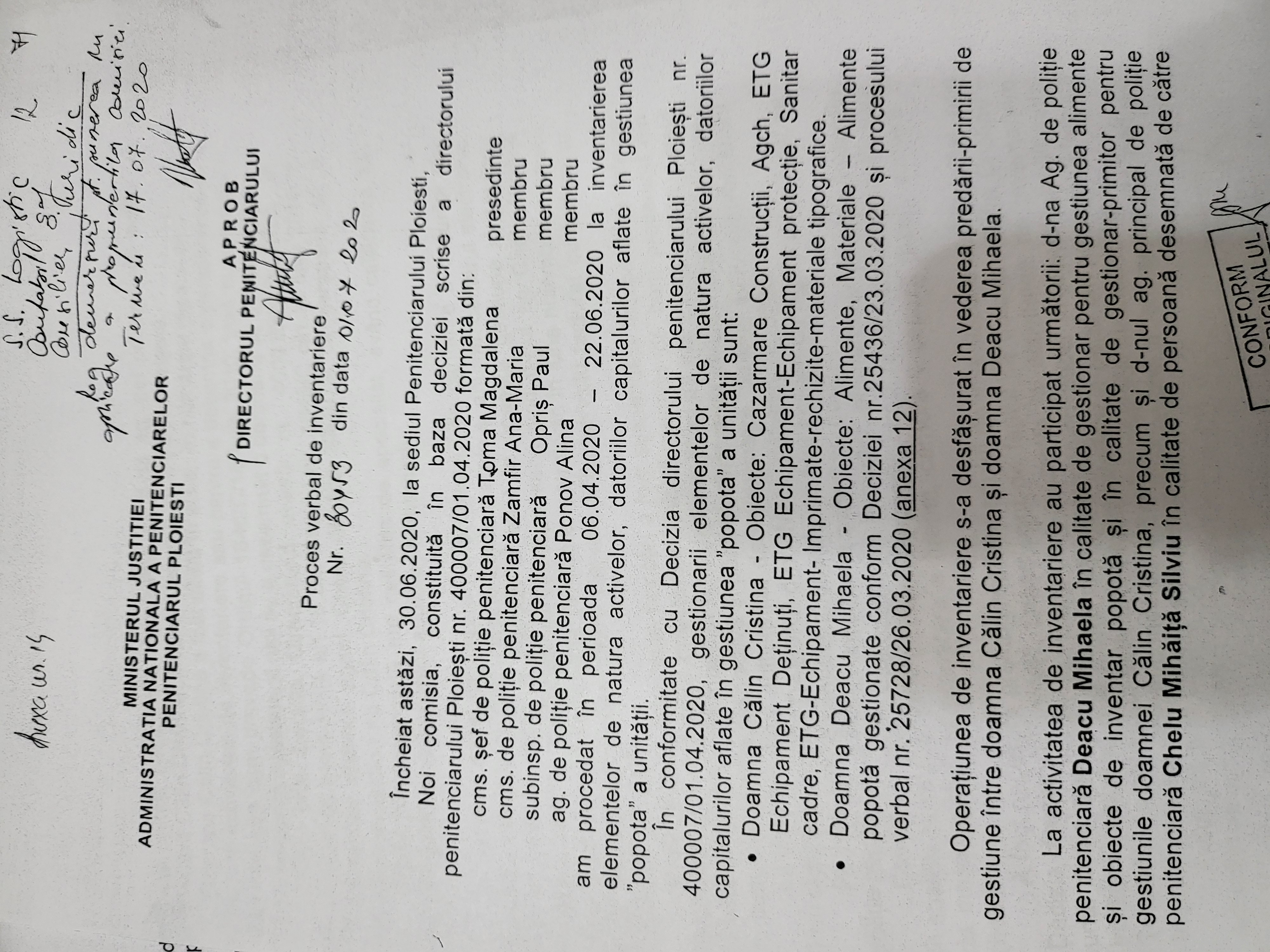 Asa cum dezvaluiam, prin Nota de Constatare nr 6104/6870/7459/05.06.2020, D.I.P (Directia Inspectie Penitenciara), sub semnaturile comisarilor Marian Popescu, Roxana Ionita si aprobat de actualul consilier al Ministrului Justitiei, Ungureanu Tiberiu (care la aceea data era seful Directiei) se constata o serie de ilegalitati cu conotatii penale si in loc sa se sesizeze organele de cercetare penala pentru furturile si falsurile depistate propun o serie de masuri, printre care sesizarea comisiei de disciplina din cadrul MJ impotriva lui Constantin Brazan (directorul Unitatii la aceea data), Valentin Matei, director adjunct la aceea data.