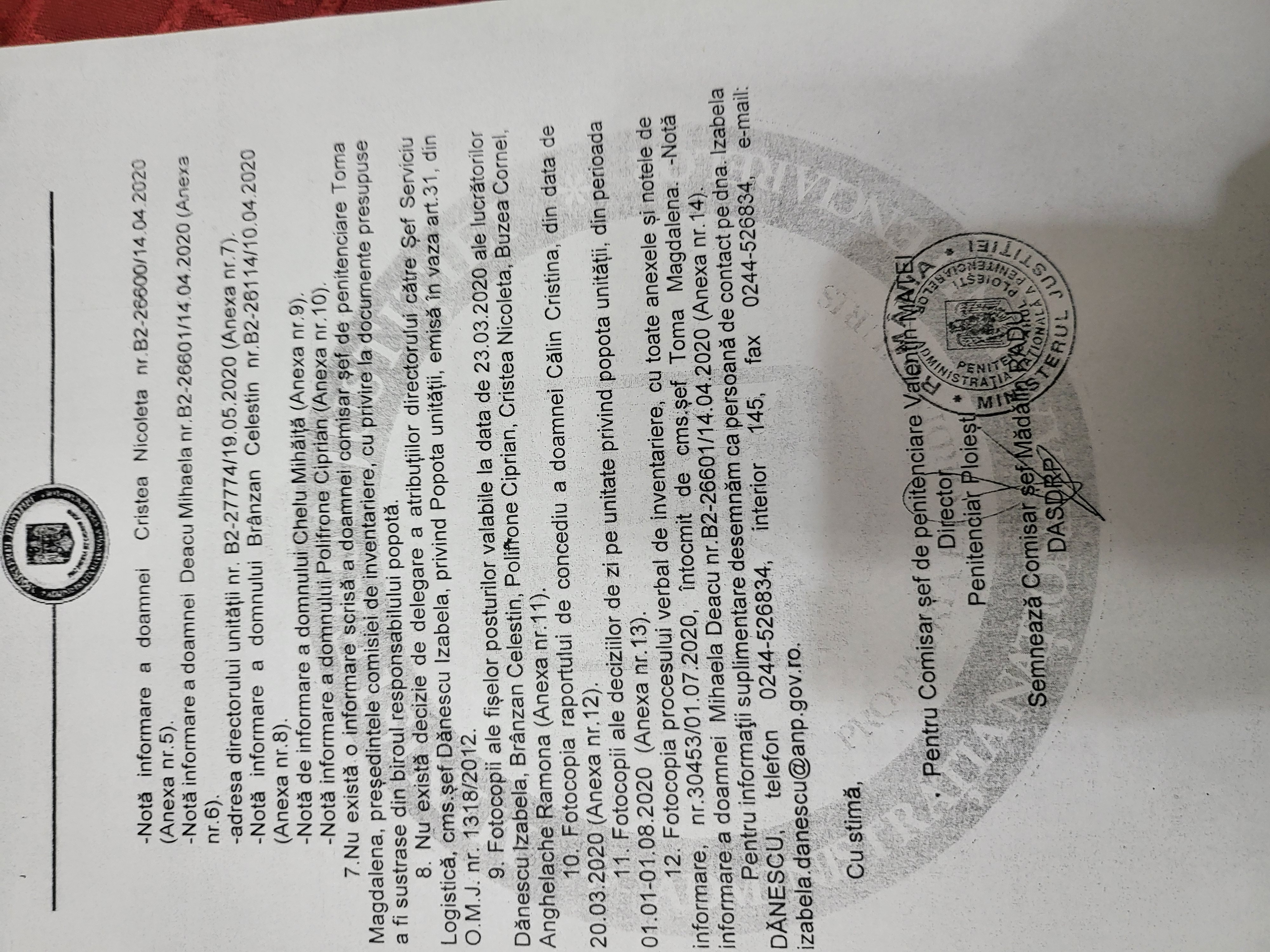 - Nu exista o informare scrisa a doamnei comisar sef de penitenciare Toma Magdalena;