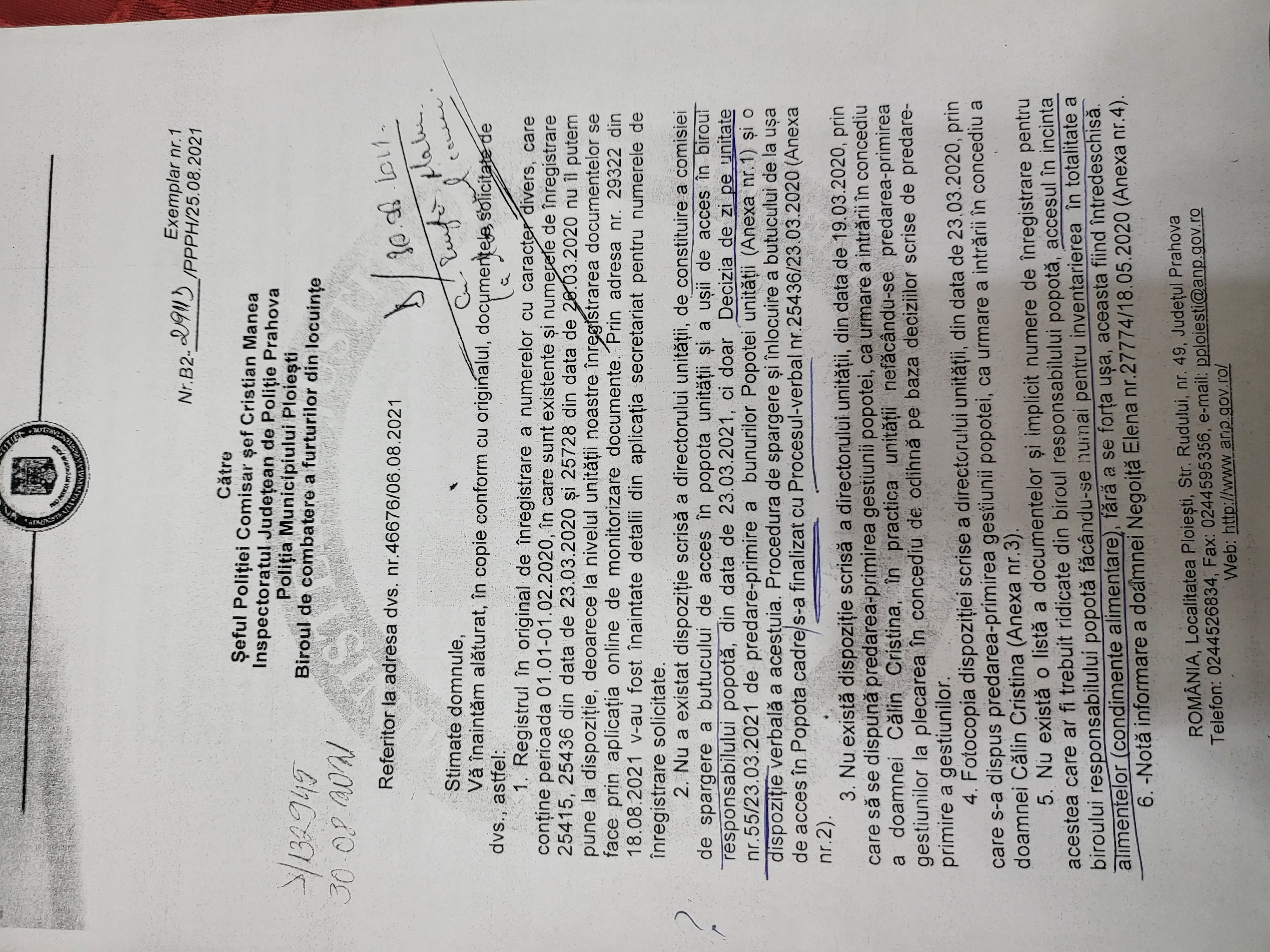 Mai mult, prin adresa nr B2 29113/PPPH/25.08.2021, simpaticul nostru imputernicit la comanda unitatii recunoaste ca: