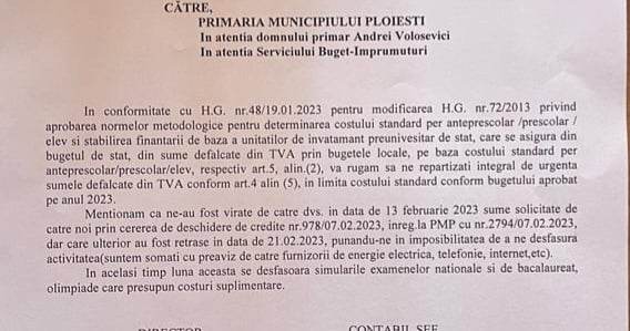 Scolile din Ploiești s-au trezit cu banii retrași din conturi, după care au primit o adresă semnată de primarul Andrei Volosevici. În document, directorilor de școli le este transmis mesajul ”Să nu efectuați nicio plată” pentru că primăria trebuie să cumpere gazele necesare agentului termic, asa cum Incisiv de Prahova a dezvaluit, in EXCLUSIVITATE!