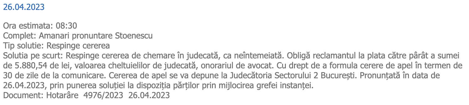 Soluția din acest dosar, de respingere a acțiunii, este un câștig al fiecărui lider sindical, al fiecărui polițist sau personal al MAI care la un moment dat a avut curajul să se opună abuzurilor, să nu accepte compromisuri de la principii sau care a refuzat vreodată să accepte ordine/dispoziții care se situau în zona „prostituției profesionale”.