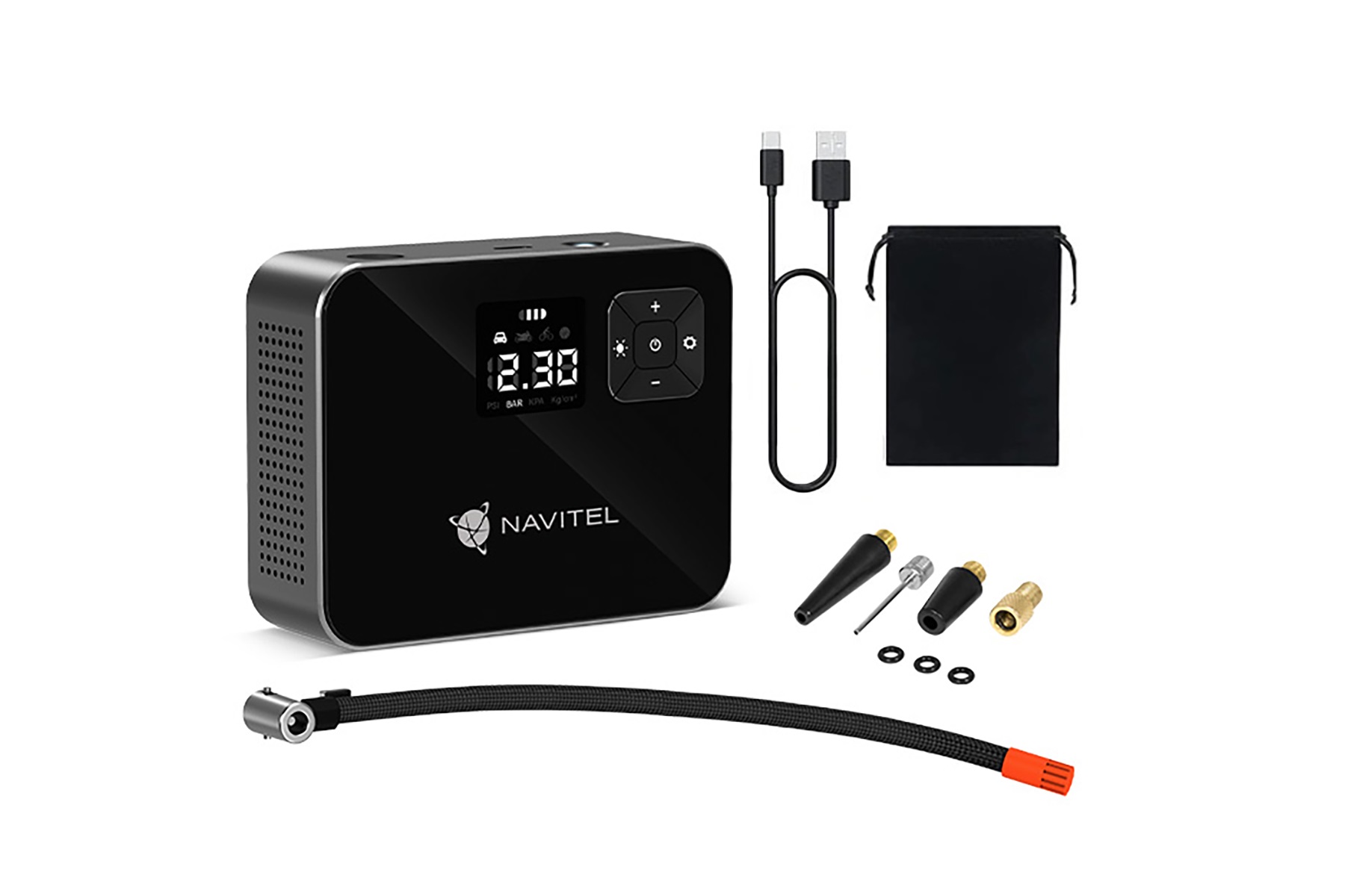 Încărcarea dispozitivului este la fel de simplă și convenabilă, datorită portului USB-C. Cu un timp de încărcare de mai puțin de 4 ore, utilizatorii pot reîncărca bateria fie prin priză, fie utilizând adaptorul de la bricheta mașinii. Pachetul NAVITEL AIR 15 AL include, pe lângă compresor, un cablu USB-C, un furtun de aer, adaptor pentru valve, o geantă de depozitare, manual de utilizare și certificat de garanție.