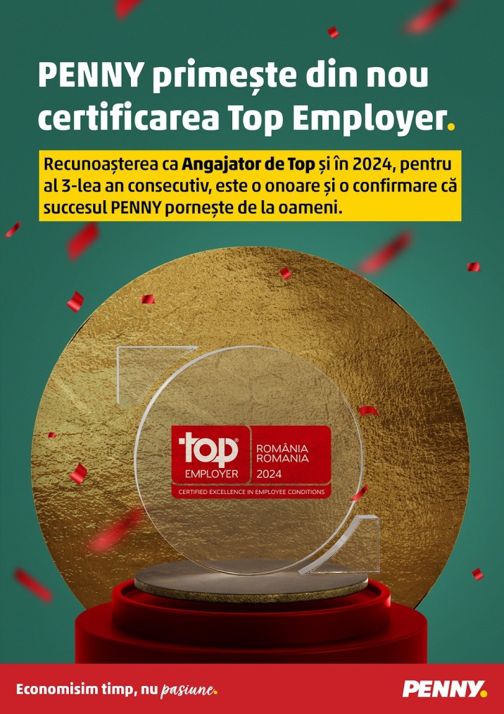 PENNY se află printre organizațiile de top care au primit titulatura de Angajator de Top (Top Employer) 2024 în România. Certificarea de Angajator de Top reflectă grija și angajamentul pentru echipă și performanțele în practicile de resurse umane.