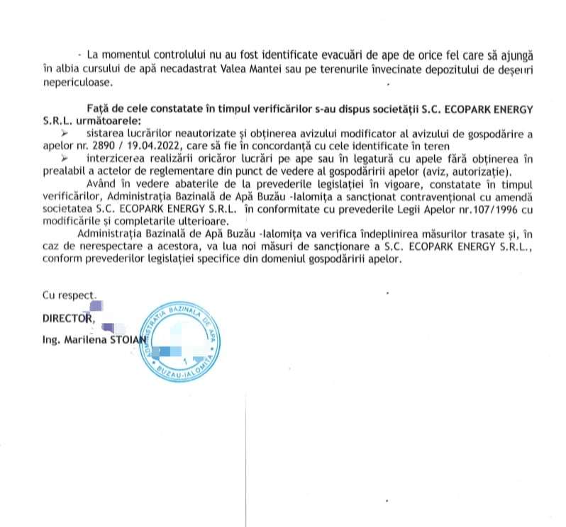 O altă instituție a statului român, fără legături cu cei care protejează mafia deșeurilor, a intervenit. Administrația Bazinală de Apă Buzău – Lalomita a descoperit ilegalități grave și a suspendat activitatea S.C. ECOPARK ENERGY S.R.L.