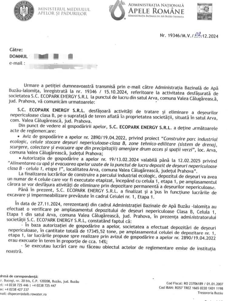 În urma unei petiții trimise către Administrația Bazinală de Apă Buzău – Lalomita, aceasta a confirmat activitățile desfășurate de S.C. ECOPARK ENERGY S.R.L. în satul Arva, comuna Valea Călugărească, care include tratarea și eliminarea deșeurilor nepericuloase de clasa B. Deși societatea deținea anumite acte de reglementare, s-au constatat lucrări neautorizate care nu făceau obiectul reglementărilor emise.