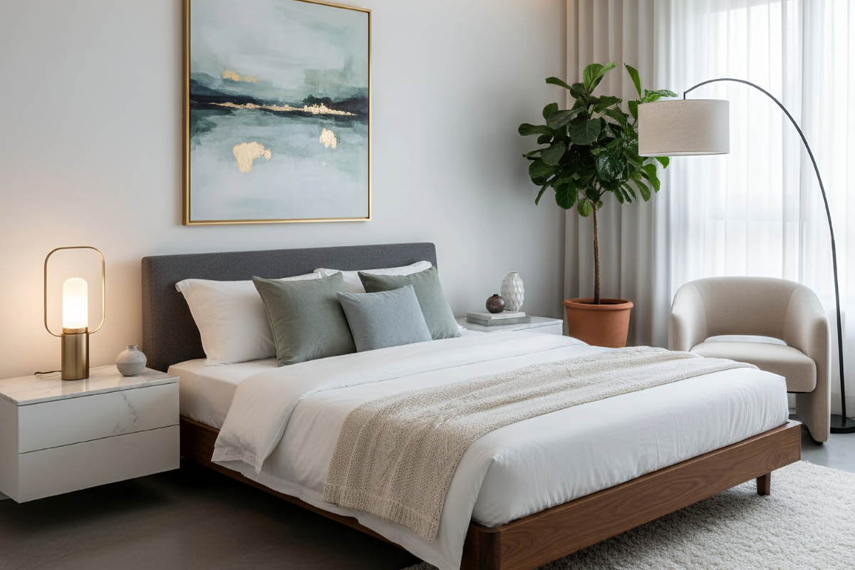 Culorile și modelele pot influența atmosfera camerei. Tonurile neutre creează un ambient relaxant și elegant, în timp ce imprimeurile sau culorile vibrante pot adăuga personalitate dormitorului.